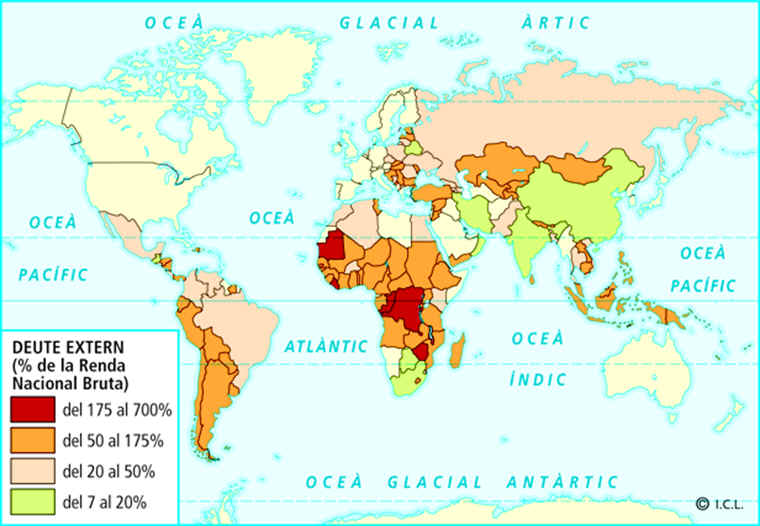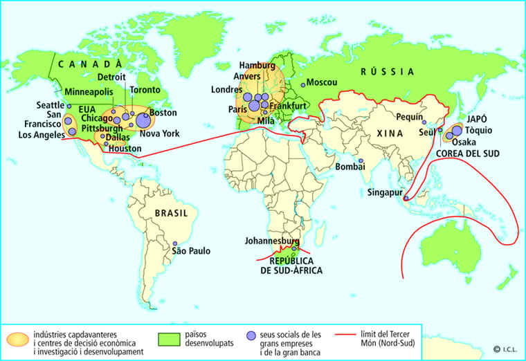 • A aquesta zona es contraposa un món subdesenvolupat, o perifèria, amb greus problemes de retard econòmic i social i una forta dependència i endeutament. És el Tercer Món.