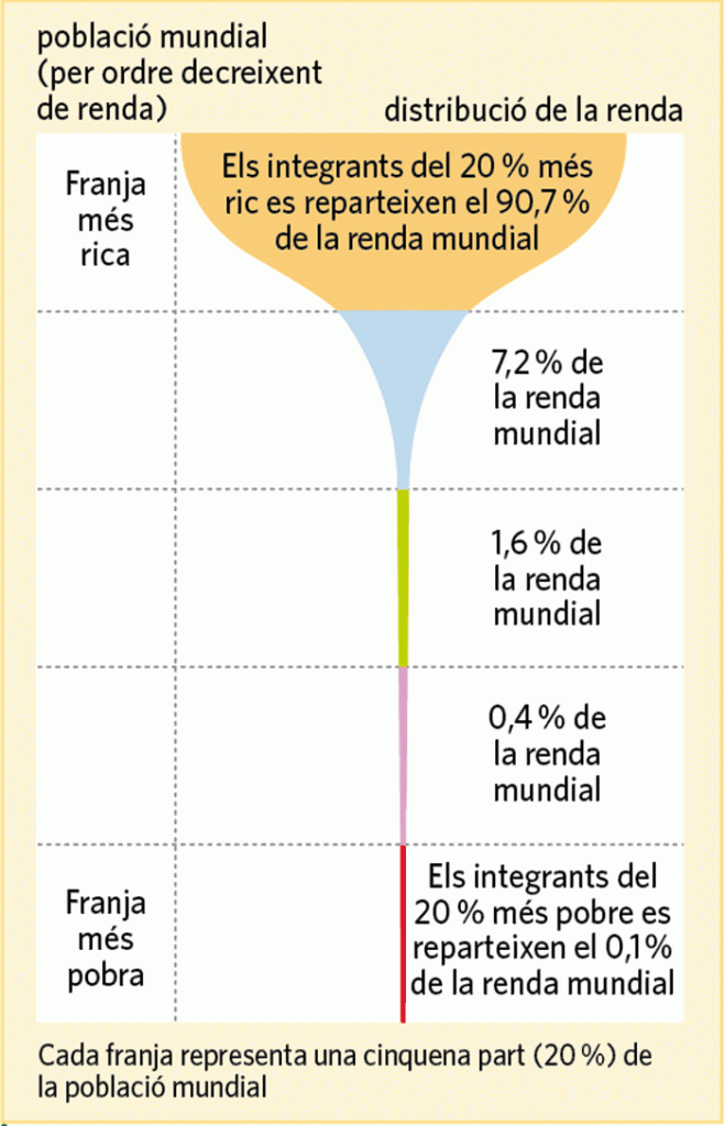 • La mundialització ha reforçat les desigualtats socials i les diferències territorials, a vegades fins i tot en un mateix país. Al món les diferències de renda entre les classes socials són abismals i hi ha 850 milions de persones que passen fam.